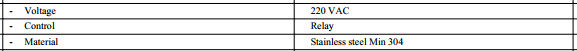 • Kontrol dan Voltase: Alat ini bekerja dengan tegangan 220 VAC dan menggunakan Relay sebagai saklar otomatisnya. Material pendukungnya menggunakan Stainless Steel Min 304 untuk mencegah korosi.